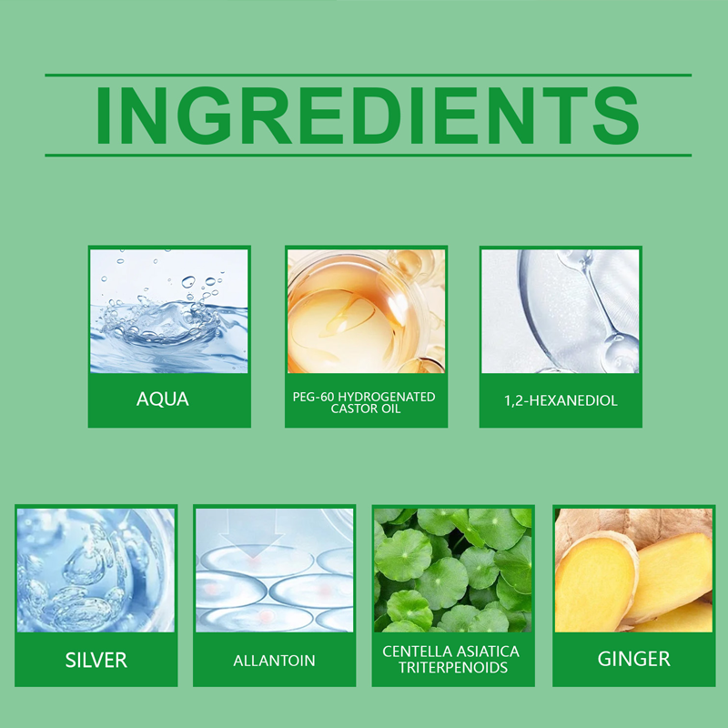 Inactive Ingredients: Water, PEG-60 Hydrogenated Castor Oil, 1,2-Hexanediol, Colloidal Silver, Allantoin