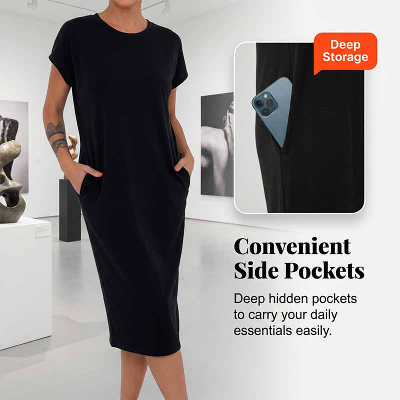 RELAXED FIT WITH POCKETS - Combining style with practicality, this dress features a loose, flowing silhouette for unrestricted movement. Convenient side pockets are seamlessly integrated, adding functionality without compromising the clean, minimalist design.